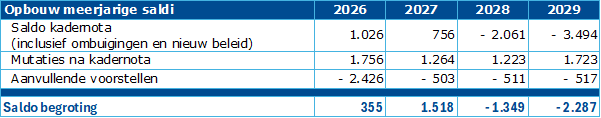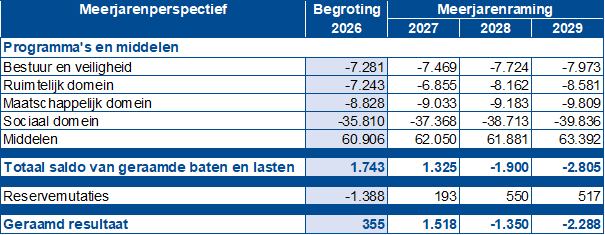 Er zijn gelukkig andere factoren die de meerjarige saldi in deze begroting positief hebben beïnvloed. En bij de kadernota heeft de gemeenteraad ook ingestemd met een aantal financiële ombuigingen die weinig of geen effect hebben op de inwoners en het beleid. De begroting 2026 vertoont hierdoor een positief saldo in de eerste twee jaren en daarna een oplopend tekort dat overzichtelijk is. Er is zelfs ruimte om een extra versterking van de reserve maatschappelijke voorzieningen te realiseren voor een bedrag van € 1,5 miljoen. Daarmee creëren we meer dekking voor investeringen die onze gemeente de komende jaren nog te wachten staan.