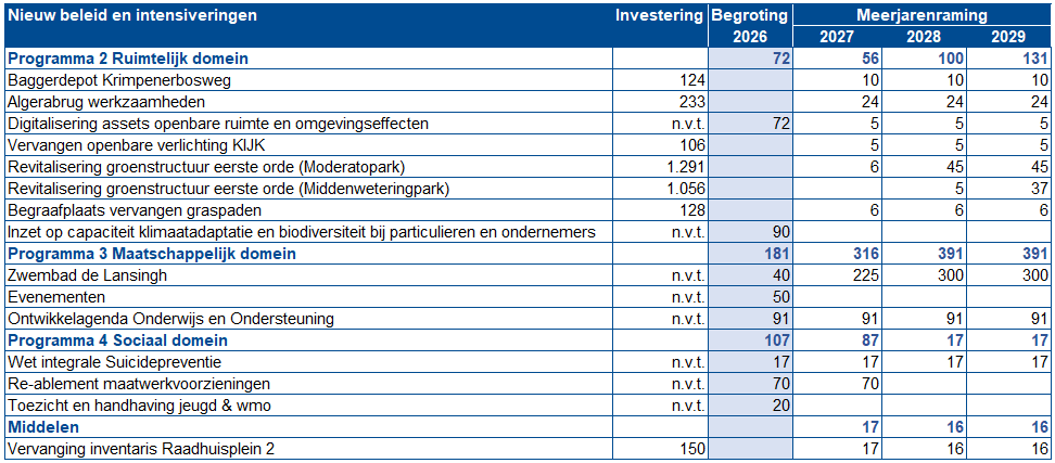 Nieuw beleid en intensiveringen staan op de betreffende programma’s. Daar zijn deze onderwerpen ook in een speerpunt opgenomen. Financieel loopt dit mee in de lasten en baten per beleidsthema/programma. Het totaaloverzicht van nieuw beleid en intensiveringen is opgenomen in de financiële begroting.