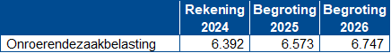 Voor de begroting is als ozb-opbrengst het volume uit 2026 geraamd en verhoogd met de reguliere gebiedsuitbreiding. Daarnaast vindt een verhoging van het ozb-volume plaats met de index van 2,5%. Dit alles geeft het volgende beeld: